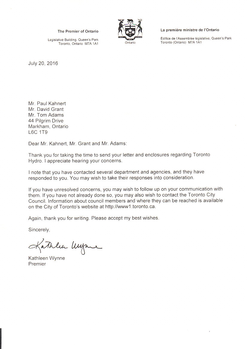 We copied our second letter to Paul Dubé to the Speaker of the House, Premier Wynne, Conservative leader Patrick Brown and NDP leader Andrea Horwath. The Speaker’s office said he “can’t comment on political matters and must remain neutral.” Wynne gave a ridiculous I’m-not-listening reply. (Attached) Patrick Brown, despite having contacted two of his offices didn’t reply at all. Only Andrea Horwath and her Energy critic, Peter Tabuns replied with any substance. (Attached)